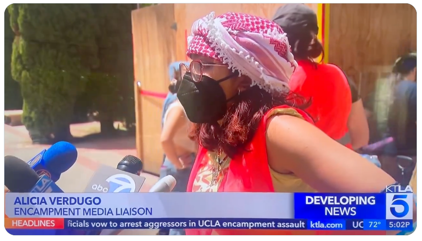 Alicia Verdugo is a student at UCLA and Encampment Media Liaison of these riots. She was arrested by UCLA Police and charged with Remaining at the Scene of a Riot.